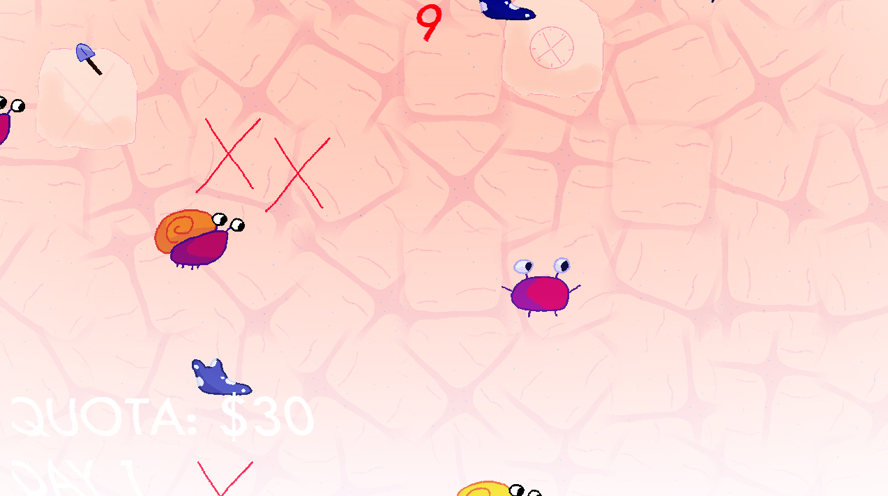 X Marks The Spot is a top-down arcade incremental time-attack hidden object game in which you have to explore a beach, looking for treasure to dig up, indicated by Xs on the ground, to get money. You have to dig up as much treasure as you can under 20 seconds before the round ends.